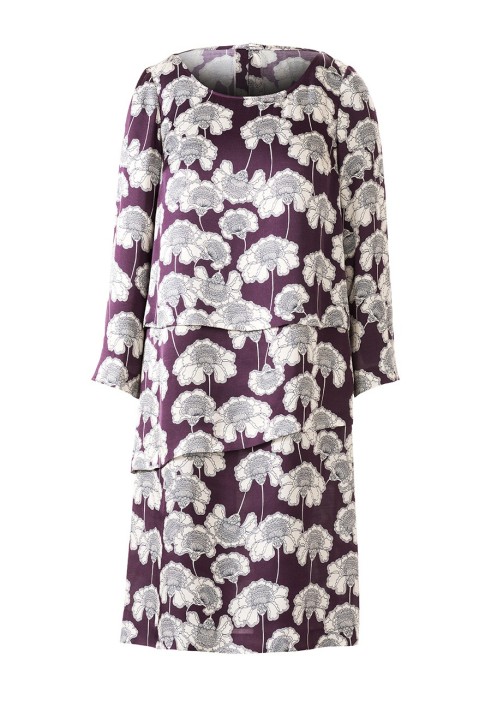 A flowy dress with a floral print and a delicate shuttle neckline, which consists of several tiers, has a very feminine look. Short flared parts of the back at the back resemble a jacket.