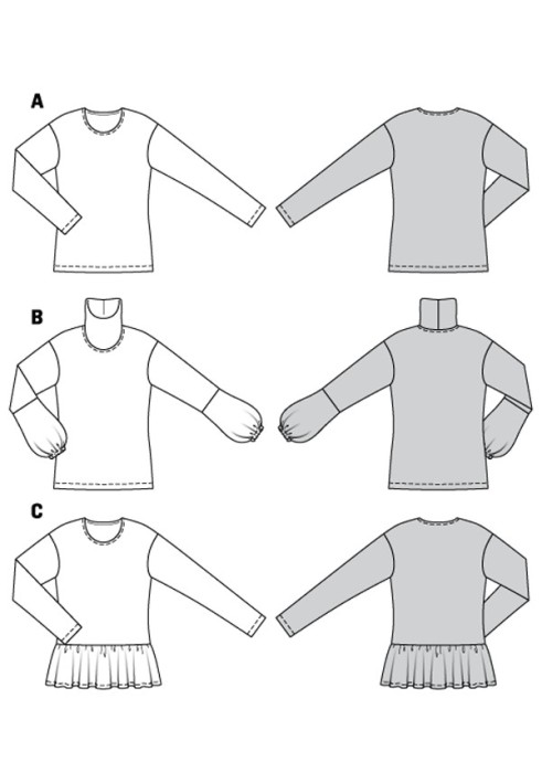 Простий трикотажний пуловер прямого крою. Доповніть базову модель деякими деталями і пошийте три різних пуловера по одній викрійці.